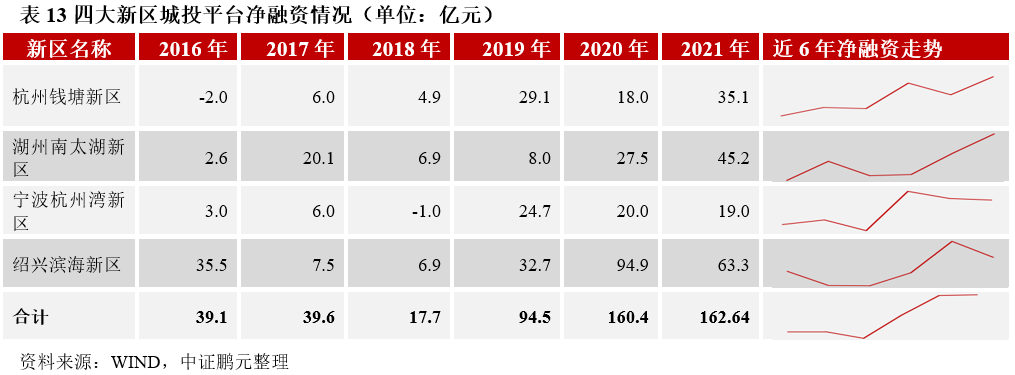 2019年后四大新區整體凈融資規模實現大幅增長,并在2021年保持相對高位,其中紹興濱海新區凈融資規模最高,杭州錢塘新區與寧波杭州灣新區規模增長較快
