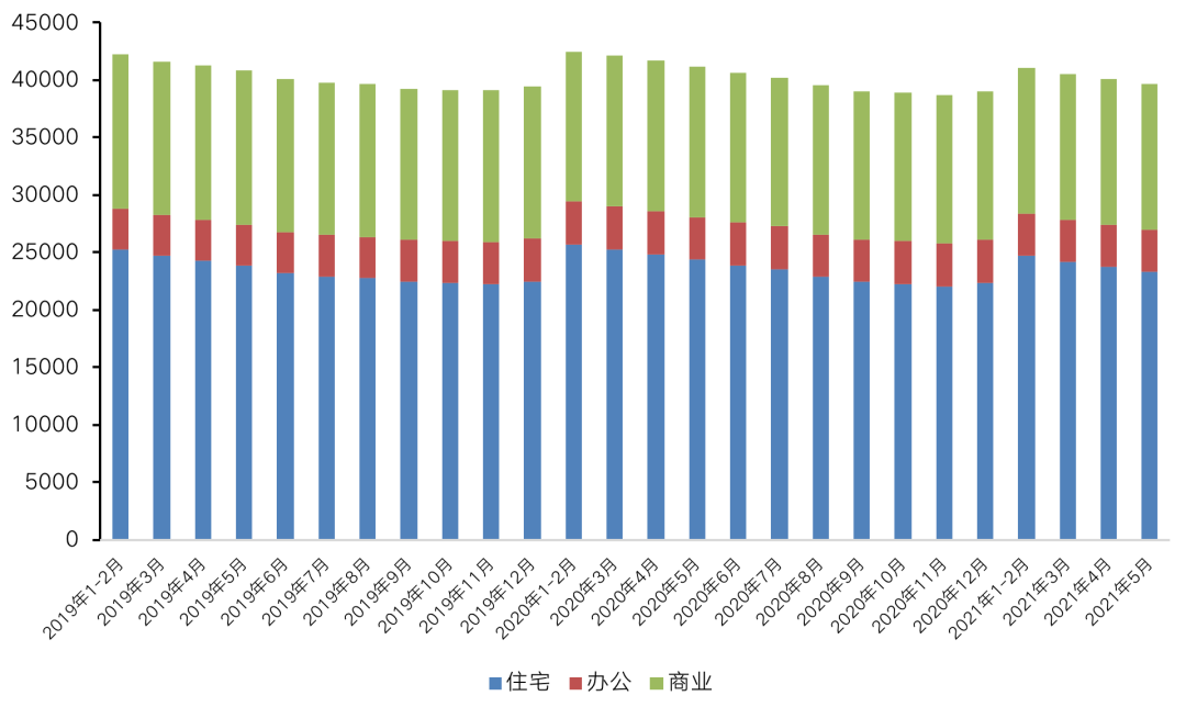 具體而言,得益于市場成交火熱,供不應求帶動整體庫存回落,住宅待售面積降幅顯著,較4月減少399萬平方米,辦公、商業(yè)待售面積降幅有限,5月較4月下降均不超20萬平方米,整體去化壓力依舊較大。