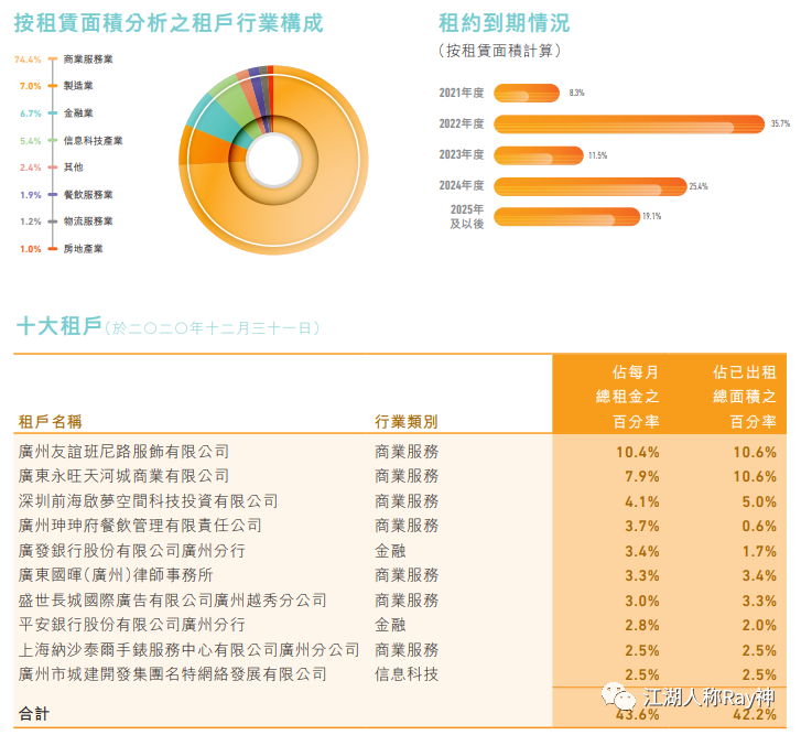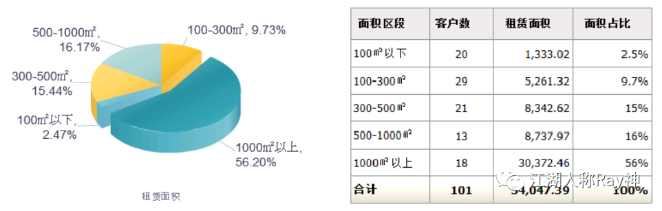 許多企業(yè)會(huì)統(tǒng)計(jì)不同行業(yè)或業(yè)態(tài)的客戶承租面積及占比,來分析影響自身項(xiàng)目穩(wěn)定性的客群特征;REITs經(jīng)常會(huì)按照承租面積來統(tǒng)計(jì)十大租戶,以識(shí)別哪些客戶對(duì)項(xiàng)目空間的影響程度大。