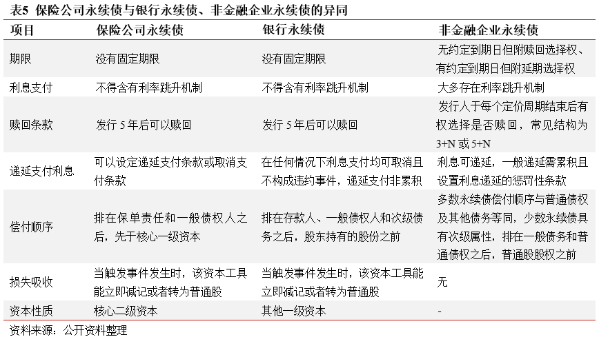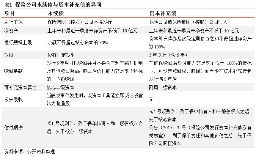 從發(fā)行主體來看,《征求意見稿》規(guī)定了保險(xiǎn)集團(tuán)(控股)公司不得發(fā)行永續(xù)債。從期限來看,永續(xù)債無固定到期期限,在償付能力充足率達(dá)標(biāo)的情況下,發(fā)行人能在發(fā)行5年后主動(dòng)選擇是否贖回永續(xù)債,較固定期限的資本補(bǔ)充債而言,穩(wěn)定性更好。從資本屬性來看,資本補(bǔ)充債用于補(bǔ)充附屬一級資本,僅有助于提高綜合償付能力充足率,而發(fā)行永續(xù)債可以補(bǔ)充核心二級資本,能同時(shí)提高核心償付能力充足率和綜合償付能力充足率。尤其重要的是,保險(xiǎn)公司永續(xù)債包含損失吸收條款,當(dāng)觸發(fā)事件發(fā)生時(shí),將進(jìn)行減記或轉(zhuǎn)股,有助于增強(qiáng)保險(xiǎn)公司在持續(xù)經(jīng)營期間的損失吸收能力。從償付順序來看,根據(jù)《保險(xiǎn)公司償付能力監(jiān)管規(guī)則第1號:實(shí)際資本》(以下簡稱“《1號規(guī)則》”)的要求,核心二級資本的受償順序列于保單持有人和一般債權(quán)人之后、先于核心一級資本,附屬一級資本的受償順序列于保單持有人和一般債權(quán)人之后、先于核心資本。