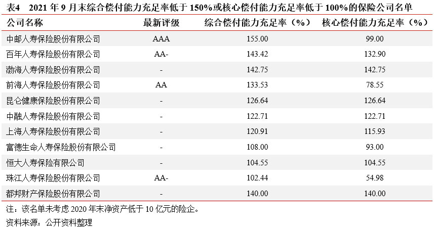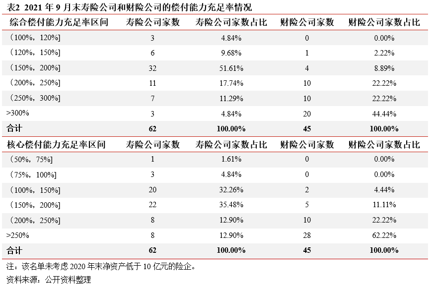 受償二代二期工程落地、壽險(xiǎn)行業(yè)轉(zhuǎn)型及車險(xiǎn)綜合改革影響,短期內(nèi)保險(xiǎn)公司償付能力充足率面臨下降壓力,其中壽險(xiǎn)公司的下降壓力更大,補(bǔ)充資本動(dòng)力更強(qiáng)。受壽險(xiǎn)產(chǎn)品結(jié)構(gòu)和代理人渠道轉(zhuǎn)型、車險(xiǎn)綜合改革等影響,保險(xiǎn)公司保費(fèi)增速承壓,疊加償二代二期工程對險(xiǎn)企資本認(rèn)定趨嚴(yán),短期內(nèi)保險(xiǎn)公司償付能力充足率有一定的下降壓力。償二代二期工程規(guī)定原計(jì)入核心一級資本的保單未來盈余將分別計(jì)入核心一級資本、核心二級資本、附屬一級資本和附屬二級資本,壽險(xiǎn)公司的核心償付能力充足率的下降幅度或?qū)⒋笥诰C合償付能力充足率,具有更為迫切的永續(xù)債發(fā)行需求。截至2021年9月末,最近一年末凈資產(chǎn)不低于10億元的壽險(xiǎn)公司和財(cái)險(xiǎn)公司償付能力充足率情況見下表,整體來看,財(cái)險(xiǎn)公司的償付能力充足率水平要高于壽險(xiǎn)公司。