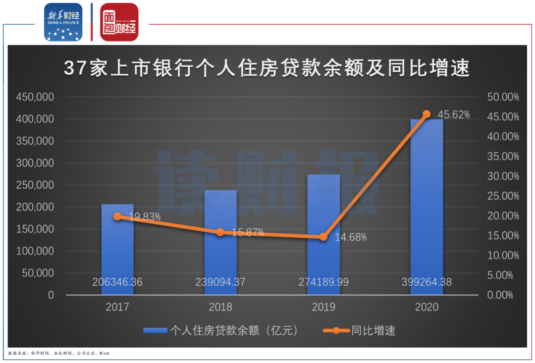 個人住房貸款方面,由于紫金銀行未詳細(xì)披露,除去該行以外,2020年37家上市銀行個人住房貸款余額達(dá)39.93萬億元,較上年末增加1.25萬億元,增幅達(dá)45.62%。