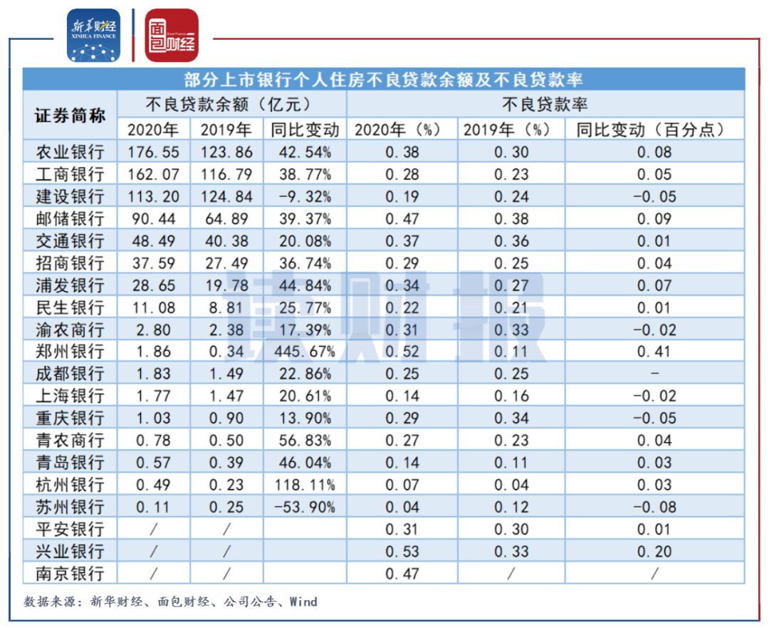 數(shù)據(jù)顯示,截至2020年末,個人住房不良貸款余額較多的仍是農(nóng)行,為176.55億元,其次是工行和建行,分別為162.07億元和113.2億元。城商行和農(nóng)商行的個人住房不良貸款余額整體偏少。與上年末相比,蘇州銀行和建行的不良貸余額出現(xiàn)下降,同比分別下降53.90%和9.32%。而鄭州銀行由于2019年基數(shù)較小,增幅超過4倍。