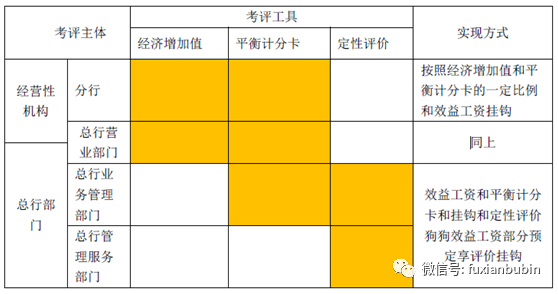 商業(yè)銀行績效考評分為經(jīng)營性機構(gòu)和總行部門兩大考評主體,其中,經(jīng)營性部門既屬于經(jīng)營性機構(gòu),又屬于總行部門,不同機構(gòu)的考評方式各有不同,所以他們的效益工資實現(xiàn)方式也存在著差異,其中最為重要的是經(jīng)濟增加值考評和平衡計分卡考評。正常績效考核基本框架如圖示: