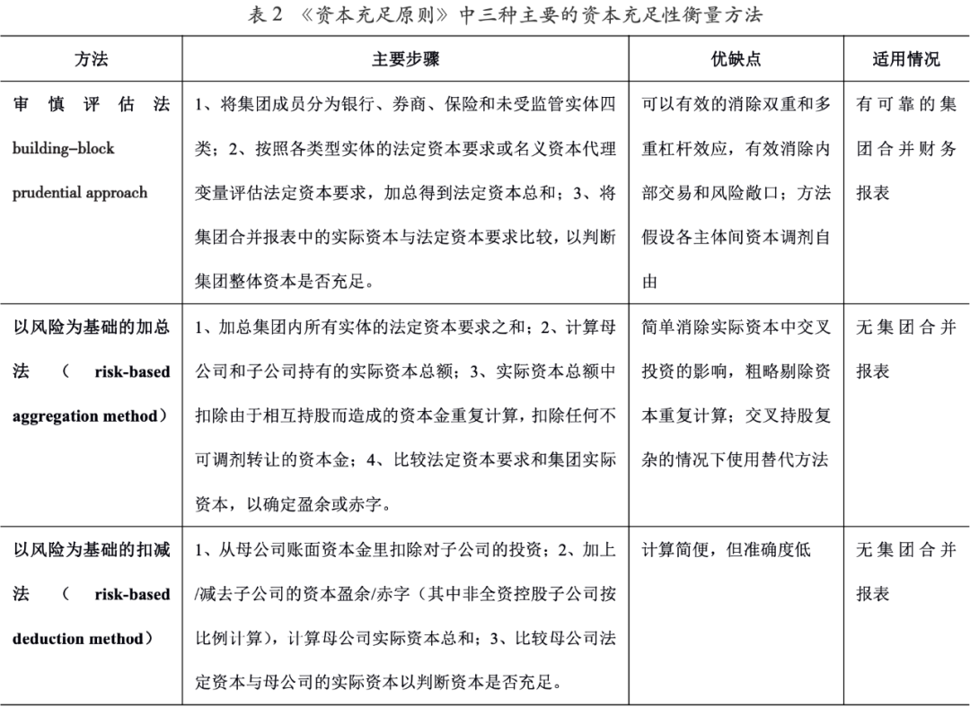 從聯(lián)合論壇推薦的三種主要方法來(lái)看,基于合并報(bào)表計(jì)算的審慎評(píng)估法準(zhǔn)確性最高,可以有效的消除雙重和多重杠桿效應(yīng),有效消除內(nèi)部交易對(duì)整體資本充足率測(cè)算的影響,但其結(jié)果高度依賴于合并報(bào)表的準(zhǔn)確性,并且對(duì)于各主體間資本自由調(diào)劑的假設(shè)不符合目前實(shí)際情況,可能忽視相關(guān)主體具體風(fēng)險(xiǎn);以風(fēng)險(xiǎn)為基礎(chǔ)的加總法思路主要是從集團(tuán)所有實(shí)體的實(shí)際資本中扣除相互持股導(dǎo)致的資本重復(fù)計(jì)算問(wèn)題,相對(duì)簡(jiǎn)單,但精確度不高,聯(lián)合論壇建議在內(nèi)部交叉持股結(jié)構(gòu)復(fù)雜的情況下,可以采用加總母公司和“識(shí)別集團(tuán)外部資本”的替代方法,其中推薦認(rèn)可的集團(tuán)外部資本主要包括:非控股股東的權(quán)益投資、第三方交易產(chǎn)生的留存收益、符合要求的資本補(bǔ)充債務(wù)工具;以風(fēng)險(xiǎn)為基礎(chǔ)的扣除法主要基于母公司報(bào)表,并假設(shè)母公司按照持股比例調(diào)劑/承擔(dān)子公司的資本盈余/不足,且未區(qū)別考慮主要股東對(duì)資本的補(bǔ)足義務(wù),未考慮子公司資本盈余的自由調(diào)劑情況,整體準(zhǔn)確性不高。