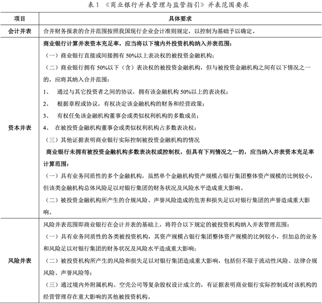 從并表的范圍來(lái)看,由于監(jiān)管目標(biāo)和會(huì)計(jì)目標(biāo)的差異,監(jiān)管機(jī)構(gòu)會(huì)在會(huì)計(jì)并表的基礎(chǔ)上,充分考慮重大風(fēng)險(xiǎn)因素,按照風(fēng)險(xiǎn)并表的思路拓展資本并表和風(fēng)險(xiǎn)并表的范圍,如聯(lián)合論壇認(rèn)為需“識(shí)別和計(jì)量所有具有潛在資本需求的重大風(fēng)險(xiǎn),無(wú)論是表內(nèi)還是表外業(yè)務(wù)風(fēng)險(xiǎn)”,如歐盟就金融控股公司視具體情況確定了三種并表范圍。我國(guó)原銀監(jiān)會(huì)在《商業(yè)銀行并表管理與監(jiān)管指引》中也明確提出了會(huì)計(jì)并表、資本并表和風(fēng)險(xiǎn)并表的三種并表范圍,具體如下表所示。