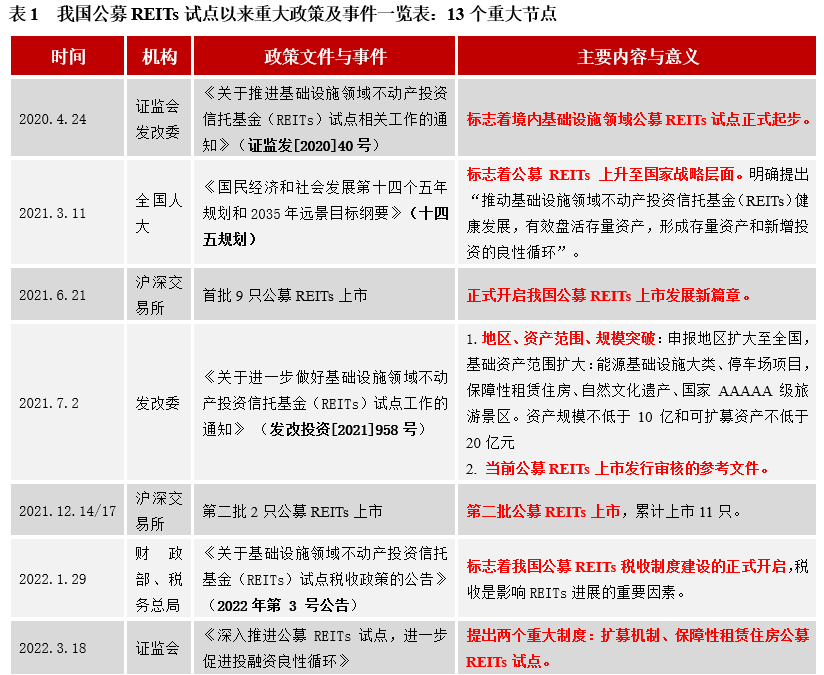 表1全面回顧和總結了我國公募REITs試點以來的13次重要進展政策和事件: