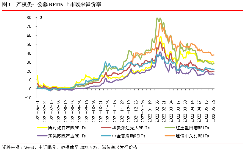 截至2022年5月27日,我國基礎設施公募REITs共發行12只,發行規模為458.12億元,總市值為517.87億元,全市場平均溢價率為13.04%,產權類(6只)平均溢價率為24.79%,特許經營權類(6只)平均溢價率為5.70%。二級市場收益率(未考慮分紅)表現最好的是富國首創水務REITs、建信中關村REITs和博時蛇口產業園REITs,溢價率分別為42.14%、37.91%、30.00%,平安廣州交投廣河高速公路REITs溢價率為-4.32%,唯一一只二級市場收益率為負的產品。作為今年目前唯一上市的中交高速公路REITs,創下最低認購比例,但二級市場表現不符合預期,目前溢價率僅為0.87%,上市首日溢價率為2.20%,上市以來最高溢價率僅為4.16%,最低溢價率為0.85%。基礎資產類型較為集中,其中產業園區REITs有4只、高速公路REITs有4只、倉儲物流和污染處理REITs均為2只。主要原始權益人中有2家央企,9家地方國企,1家外商獨資企業。目前正在申報審核的REITs有6只,新增1單發電和2單保障性租賃住房項目類型。