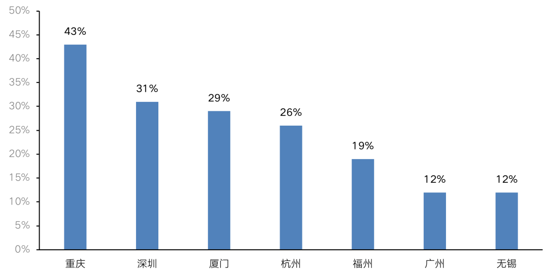 不止杭州,土拍市場(chǎng)越熱的城市,房企一般都要面臨高溢價(jià),或更為嚴(yán)苛的競(jìng)拍規(guī)則,而“溢價(jià)”、“自持”、“限價(jià)”也成為成交地塊最大的關(guān)注點(diǎn)。其中重慶整體溢價(jià)率高達(dá)43%,主城區(qū)46宗地塊中有31宗溢價(jià)率超40%,占比近8成,最高溢價(jià)率達(dá)到130%。再如北京,由于設(shè)置地價(jià)上限,競(jìng)拍地塊轉(zhuǎn)競(jìng)公租房、自持等環(huán)節(jié),可售面積減少,拿地成本也隱形抬高。