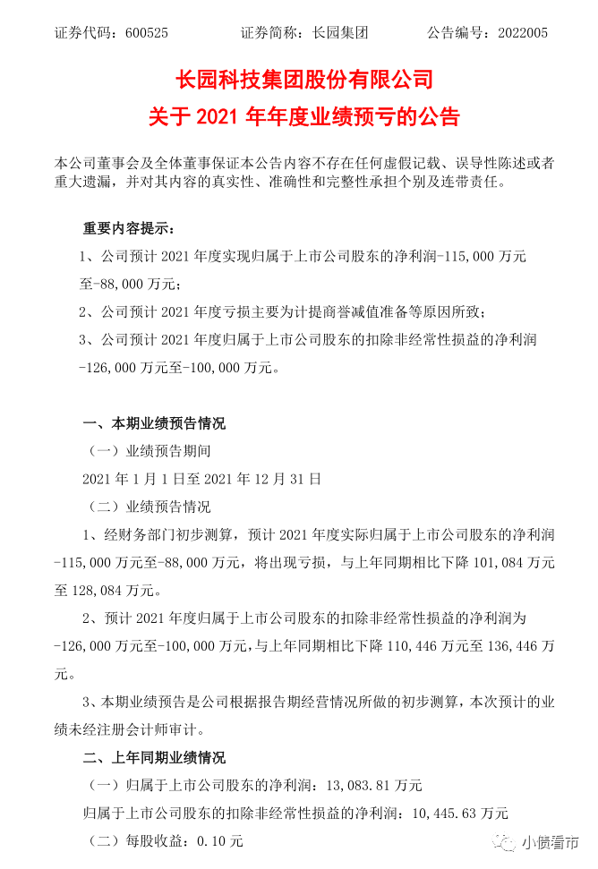 近日,長園集團(600525.SH)公布2021年年度業績預虧公告,公司預計2021年度實現歸屬于上市公司股東的凈利潤-11.5億元至-8.8億元,與上年同期1.308億元相比由盈轉虧。