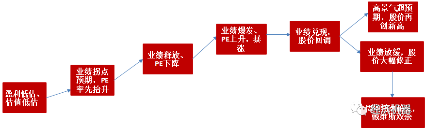 一般來(lái)說(shuō),周期底部,盈利低點(diǎn),PE/PB估值處于極低水平(對(duì)周期股而言,也可能高PE/低PB)。此時(shí),一旦自下而上出現(xiàn)業(yè)績(jī)拐點(diǎn)信號(hào),PE/PB估值會(huì)率先上升;而后,業(yè)績(jī)釋放,PE出現(xiàn)大幅下降。如果業(yè)績(jī)進(jìn)一步爆發(fā),盈利增速顯著高于趨勢(shì)增長(zhǎng)水平。就會(huì)出現(xiàn)“戴維斯雙擊”,股價(jià)暴漲。隨后,如果業(yè)績(jī)兌現(xiàn),同時(shí)明年業(yè)績(jī)回到趨勢(shì)增長(zhǎng)水平,則估值會(huì)向合理水平調(diào)整,股價(jià)出現(xiàn)回落。此后,如果高景氣被證明仍可持續(xù),則股價(jià)有望再創(chuàng)新高,估值再次提升;反之,如果業(yè)績(jī)隨后出現(xiàn)放緩,股價(jià)有望大幅修正。一旦周期拐點(diǎn)確認(rèn),則會(huì)出現(xiàn)猛烈的殺估值現(xiàn)象(圖3),即所謂“戴維斯雙殺”(圖)。當(dāng)然,周期波動(dòng)并非是圍繞不變中樞的簡(jiǎn)單輪回,更可能是波動(dòng)中樞緩慢抬升。