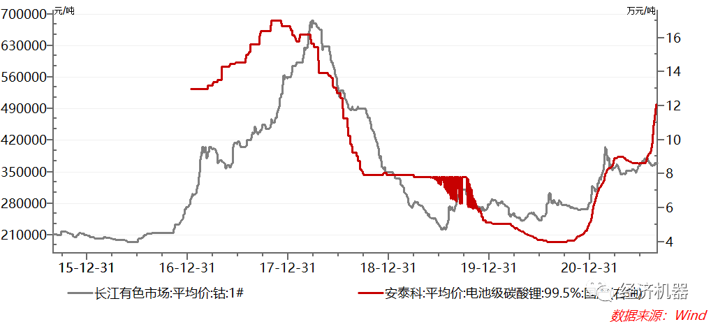 圖7、電池級(jí)碳酸鋰和鈷現(xiàn)貨價(jià)格