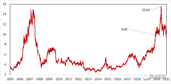 1)部分核心資產(chǎn)盡管估值極貴,但如果超高景氣能夠在更長(zhǎng)時(shí)間內(nèi)維持,則仍有可能反彈并創(chuàng)新高。比如今年的新能源汽車和光伏等板塊,我們年初曾經(jīng)并不看好,但由于業(yè)績(jī)“兌現(xiàn)”了高增長(zhǎng),并在“雙碳”概念催化下,預(yù)期高景氣更長(zhǎng)時(shí)間內(nèi)持續(xù),龍頭創(chuàng)出了新高(圖6)。高估值是“泡沫”破滅的必要但非充分條件,高景氣如果更長(zhǎng)時(shí)間內(nèi)存在,也會(huì)消化高估值,從而使調(diào)整維持在半年線/年線級(jí)別,并保持中期向上趨勢(shì)。