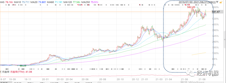 2)部分“核心資產(chǎn)”業(yè)績(jī)保持穩(wěn)定,也會(huì)因?yàn)楦吖乐岛惋L(fēng)格切換而出現(xiàn)中級(jí)別調(diào)整,但上升趨勢(shì)未破。比如部分白酒股,中報(bào)業(yè)績(jī)符合預(yù)期。但隨著資金從核心資產(chǎn)撤離,再加上高估值內(nèi)在調(diào)整需求,也會(huì)出現(xiàn)一波調(diào)整。一般情況下,到了年線就會(huì)有較強(qiáng)支撐。但由于本輪中,前期漲幅過(guò)大,風(fēng)格切換更加堅(jiān)決,跌破年線成為常態(tài),但一般不會(huì)跌破3年線。價(jià)格回調(diào)(比如50%),疊加業(yè)績(jī)?cè)鲩L(zhǎng)(比如20%-30%),則會(huì)迅速消化掉高估值,然后有望再次向上。