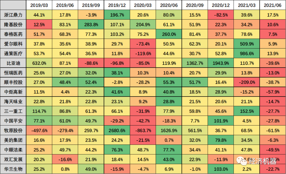 4)部分核心資產(chǎn)“業(yè)績(jī)暴雷”,或者邏輯出現(xiàn)松動(dòng),一般會(huì)出現(xiàn)經(jīng)典的“戴維斯雙殺”。半年報(bào)顯示,大批核心資產(chǎn)股票業(yè)績(jī)出現(xiàn)暴雷,數(shù)量之多,幅度之大,歷史上也是不多見(jiàn)的。一些大牛股,比如海天味業(yè)、恒瑞醫(yī)藥等過(guò)去十年,從來(lái)未出現(xiàn)過(guò)當(dāng)季凈利潤(rùn)同比出現(xiàn)負(fù)增長(zhǎng),但今年都出現(xiàn)了(圖8)。這里面有行業(yè)新政的因素(比如帶量采購(gòu)),有高基數(shù)的因素,也有整體環(huán)境因素。不管怎么說(shuō),一旦業(yè)績(jī)出現(xiàn)暴雷,處于估值高位的核心資產(chǎn),必會(huì)出現(xiàn)經(jīng)典的“戴維斯雙殺”,經(jīng)歷“股價(jià)下跌-PE下降-盈利下跌-PE上升-股價(jià)進(jìn)一步下跌-PE回落”等幾個(gè)階段。目前來(lái)看,部分暴雷核心資產(chǎn)估值仍然虛高,仍有進(jìn)一步殺估值的空間。