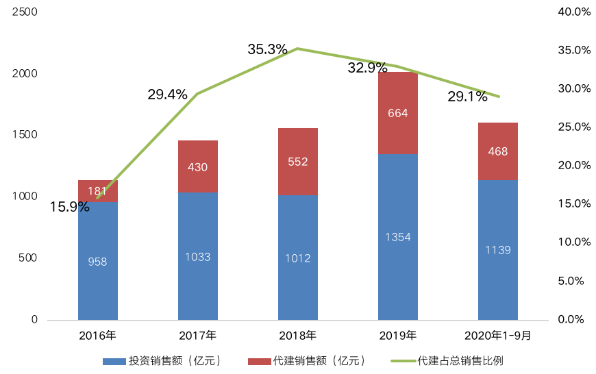 綠城代建每年可為企業貢獻30%左右的銷售額,還可幫助企業提升品牌、輸出物業管理業務。綠城目前已將旗下的綠城管理成功打造上市,根據綠城中國披露的業績公告,2020年1-9月企業共實現銷售額1961億元,其中代建貢獻了560億元的銷售,占企業總銷售額的比例為29%。