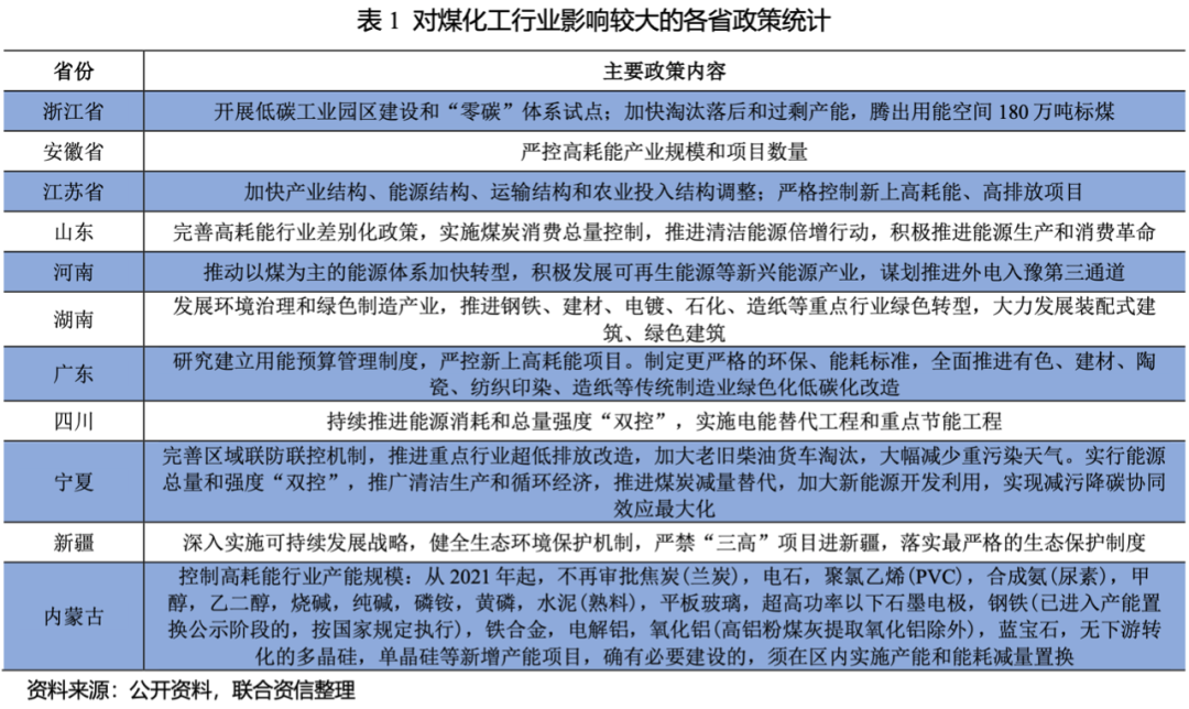 為實(shí)現(xiàn)碳中和目標(biāo),各省已出臺(tái)了相應(yīng)政策。通過政策梳理發(fā)現(xiàn)部分省份政策對(duì)煤化工未來發(fā)展制約性較大;主要表現(xiàn)在(1)嚴(yán)格控制高能耗、高排放“雙高”項(xiàng)目的審批;(2)淘汰落后產(chǎn)能和過剩產(chǎn)能,實(shí)現(xiàn)燃煤指標(biāo)釋放;(3)加快超低排放改進(jìn);加快能源結(jié)構(gòu)調(diào)整,如煤化工企業(yè)的電力、蒸汽等二次能源的源頭結(jié)構(gòu)等;(4)采用碳排放交易增加企業(yè)環(huán)境保護(hù)動(dòng)力。