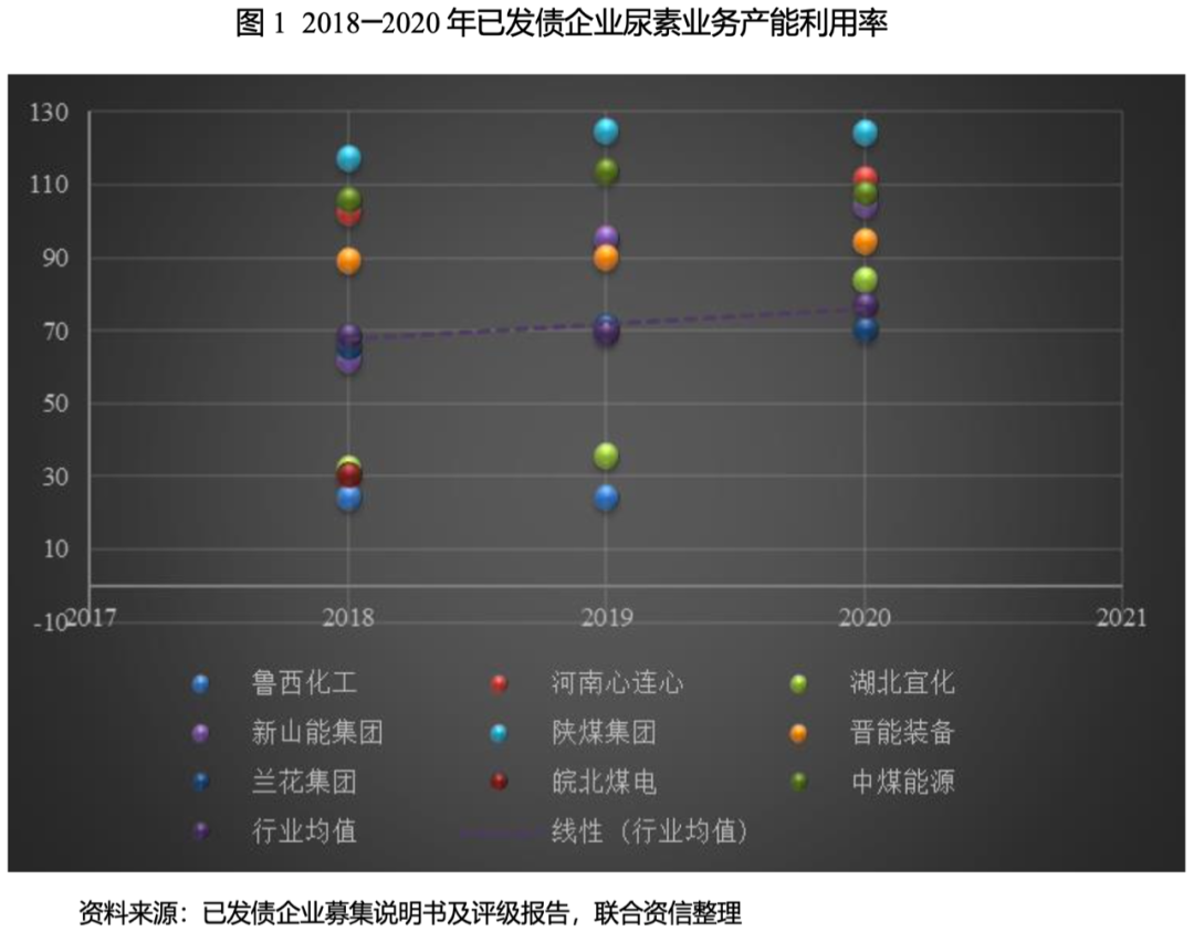 通過下圖已發(fā)債尿素企業(yè)的產(chǎn)能利用率分布可以看出,2018年,魯西化工、湖北宜化、新山能集團(tuán)、山西蘭花煤炭實(shí)業(yè)集團(tuán)有限公司(以下簡稱“蘭花集團(tuán)”)和安徽省皖北煤電集團(tuán)有限責(zé)任公司(以下簡稱“皖北煤電”)尿素產(chǎn)能利用率均低于行業(yè)均值。皖北煤電的子公司安徽淮化集團(tuán)有限公司已于2018年停產(chǎn)整頓,后期不再生產(chǎn)尿素。