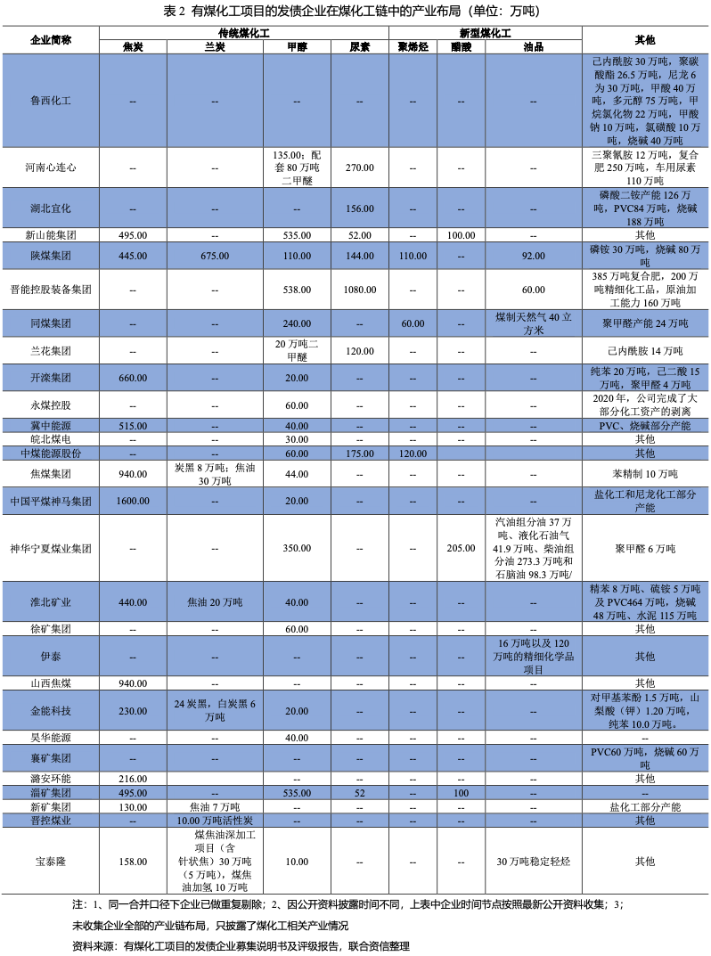 目前公開市場上有煤化工項(xiàng)目的發(fā)債企業(yè)主要有大型煤炭企業(yè)向煤化工產(chǎn)業(yè)鏈延伸以及少數(shù)無煤炭資源的化工企業(yè),以大型煤炭企業(yè)為主。通過對(duì)已發(fā)債煤化工項(xiàng)目的企業(yè)產(chǎn)業(yè)布局統(tǒng)計(jì)發(fā)現(xiàn):煤化工產(chǎn)業(yè)布局主要以傳統(tǒng)煤化工為主,其中焦炭產(chǎn)能合計(jì)7264萬噸,蘭炭675萬噸,甲醇2887萬噸(部分作為中間產(chǎn)品下游部分配套聚烯烴產(chǎn)業(yè)),尿素2049萬噸。部分企業(yè)配套煤焦油、粗苯加氫精制、二甲醚等產(chǎn)能。新型煤化工產(chǎn)業(yè)布局較少,其中聚烯烴合計(jì)產(chǎn)能290萬噸,主要分布在晉能控股煤業(yè)集團(tuán)有限公司(原“同煤集團(tuán)”)、陜西煤業(yè)化工集團(tuán)有限責(zé)任公司(以下簡稱“陜煤集團(tuán)”)、中國中煤能源股份有限公司(以下簡稱“中煤能源”);醋酸產(chǎn)能合計(jì)405萬噸,主要分布在山東能源集團(tuán)有限公司(以下簡稱“新山能集團(tuán)”)、國家能源集團(tuán)寧夏煤業(yè)有限責(zé)任公司和淄博礦業(yè)集團(tuán)有限責(zé)任公司。由于煤制天然氣、煤制油的煤油價(jià)格盈虧平衡點(diǎn)較高,該部分業(yè)務(wù)產(chǎn)能較少,如內(nèi)蒙古伊泰集團(tuán)有限公司等部分企業(yè)前期規(guī)劃的在建項(xiàng)目也已暫停。