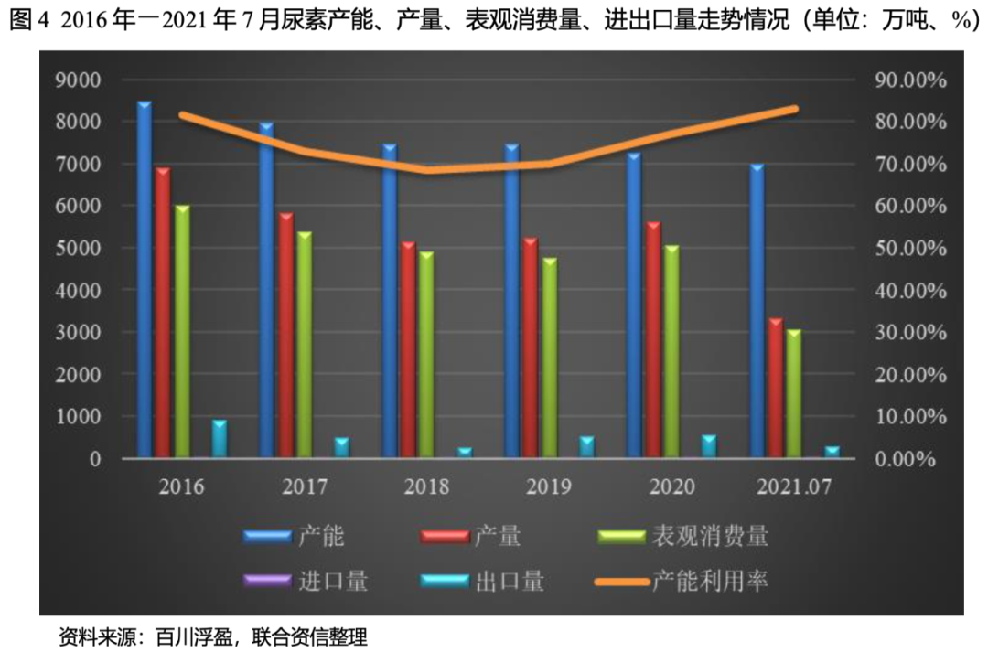近年來,隨著環(huán)保約束趨嚴(yán)和市場化出清,尿素行業(yè)落后產(chǎn)能逐步被淘汰退出市場,同時(shí)采用先進(jìn)工藝的裝置陸續(xù)投產(chǎn),行業(yè)整體產(chǎn)能穩(wěn)中有降。2016-2020年,我國尿素行業(yè)年均復(fù)合下降7.62%,其中,煤頭尿素年均復(fù)合下降5.42%,氣頭尿素年均復(fù)合下降2.19%。2021年,我國尿素產(chǎn)能合計(jì)6976萬噸,有效產(chǎn)能合計(jì)6355萬噸。受益于落后產(chǎn)能的逐步出清,尿素行業(yè)產(chǎn)能利用率從2019年逐年回升,2021年7月產(chǎn)能利用率為83.15%,已處于近5年最高水平。