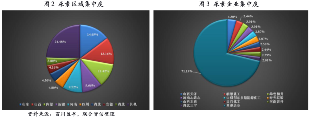 從區(qū)域集中度來看,山東、山西、內(nèi)蒙產(chǎn)能占比靠前,占比分別為14.69%、13.16%和11.42%,但整體較為分散。從企業(yè)集中度來看,前十大企業(yè)產(chǎn)能合計(jì)占比28.81%,排名靠前的企業(yè)分別為山西天澤煤化工集團(tuán)股份公司、山東潤銀生物化工股份有限公司和山東華魯恒升化工股份有限公司(以下簡稱“華魯恒升”),占比分別為4.30%、3.44%和3.01%。整體看,尿素行業(yè)集中度較低。