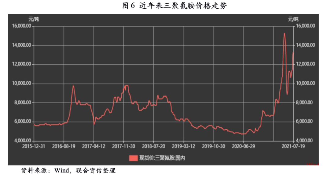 三聚氰胺方面,生產(chǎn)一噸三聚氰胺大約需要3噸尿素,三聚氰胺產(chǎn)量已由2016年的96.68萬噸增長至2020年的133.25萬噸,年均復(fù)合增長8.35%。目前三聚氰胺價(jià)格較高,單噸利潤較好,三聚氰胺整體開工率較高。2021年三聚氰胺有效產(chǎn)能為168.50萬噸,若產(chǎn)能完全釋放將帶動(dòng)尿素需求較2020年增加約100萬噸。