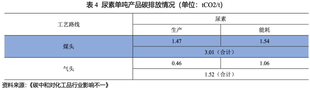 從化學(xué)反應(yīng)過程來看,煤化工是通過化學(xué)手段將原料煤中絕大部分的碳轉(zhuǎn)化為另一種能源型產(chǎn)品及含碳化學(xué)品,在生產(chǎn)過程中會(huì)排放部分二氧化碳;同時(shí),煤化工在電力和熱力供應(yīng)上會(huì)使用燃料煤,進(jìn)而會(huì)有能耗排放。單噸煤頭尿素產(chǎn)品在生產(chǎn)過程中將排放二氧化碳1.47噸,生產(chǎn)能耗過程中排放二氧化碳1.54噸;合計(jì)排放3.01噸。單噸氣頭尿素在生產(chǎn)過程中將排放二氧化碳0.46噸,能耗過程中排放1.06噸,合計(jì)排放1.52噸。總體看,氣頭尿素碳排放量較少,煤頭尿素碳排放量較多。氣頭尿素和煤頭尿素能耗產(chǎn)生的碳排放量均大于碳轉(zhuǎn)換過程中的碳排放。