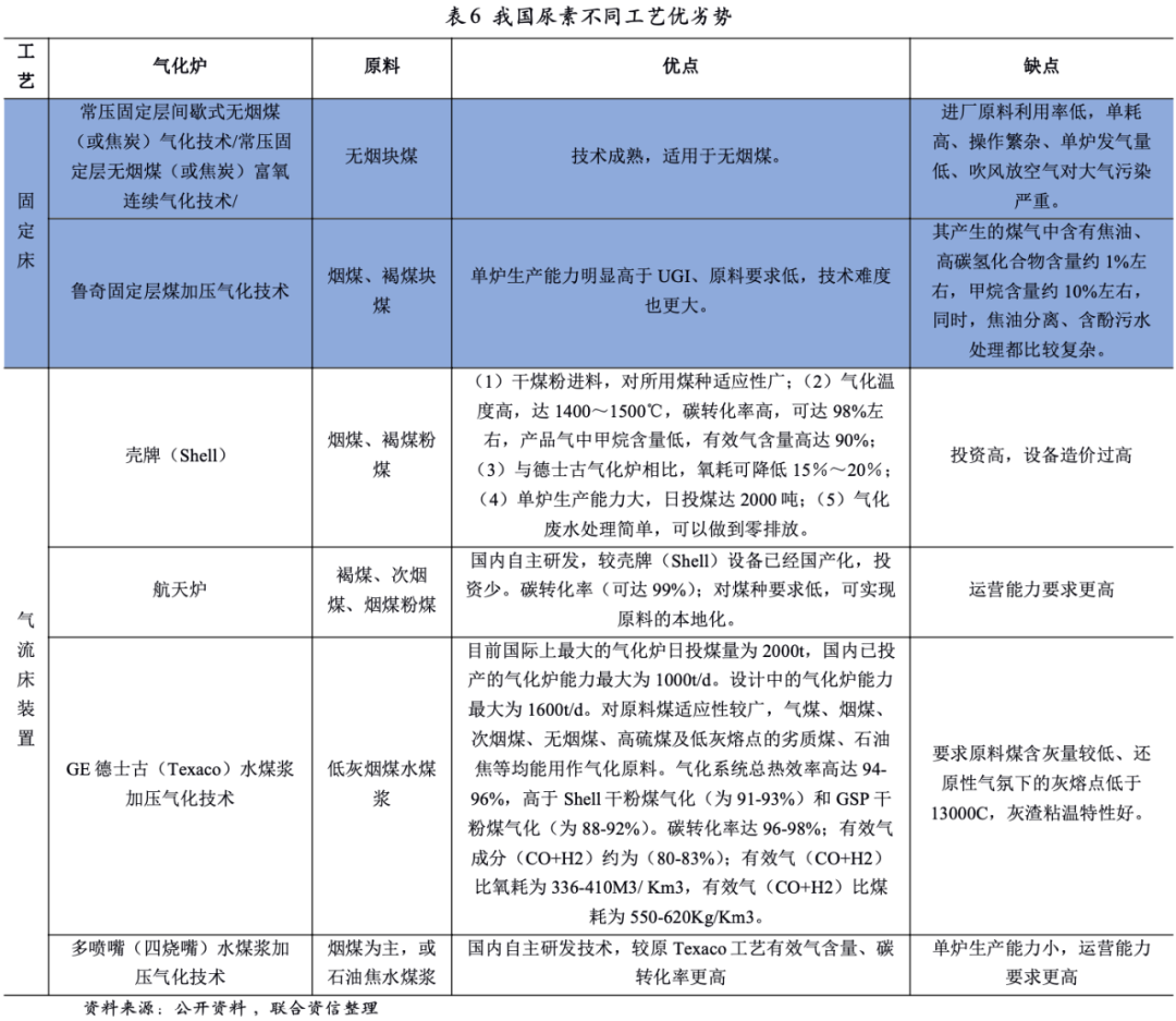 當(dāng)前煤制尿素煤化工生產(chǎn)裝置主要分為兩類,一種是固定床裝置,一種是氣流床裝置。其中氣流床從進(jìn)料方式上又可以分為干法(干粉進(jìn)料)和濕法(水煤漿進(jìn)料)。干法氣化裝置目前在國內(nèi)應(yīng)用較多的主要有殼牌(Shell)和航天爐;濕法氣化裝置目前在國內(nèi)應(yīng)用較多的有GE德士古(Texaco)、四噴嘴等,這些氣化爐在原材料、能耗、碳轉(zhuǎn)化率、投資規(guī)模等各方面均不同,具體優(yōu)劣勢(shì)如下表所示。