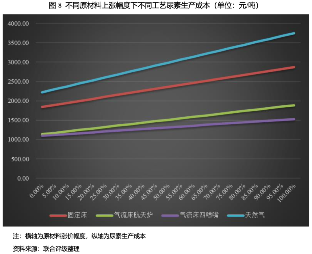 (2)原材料及產(chǎn)品價(jià)格數(shù)據(jù)選取存在一定的局限性,例如天然氣價(jià)格選取了全國液化天然氣LNG市場價(jià)測算,與市場上尿素生產(chǎn)企業(yè)的燃?xì)獠少彸杀敬嬖诓町悺?/p>