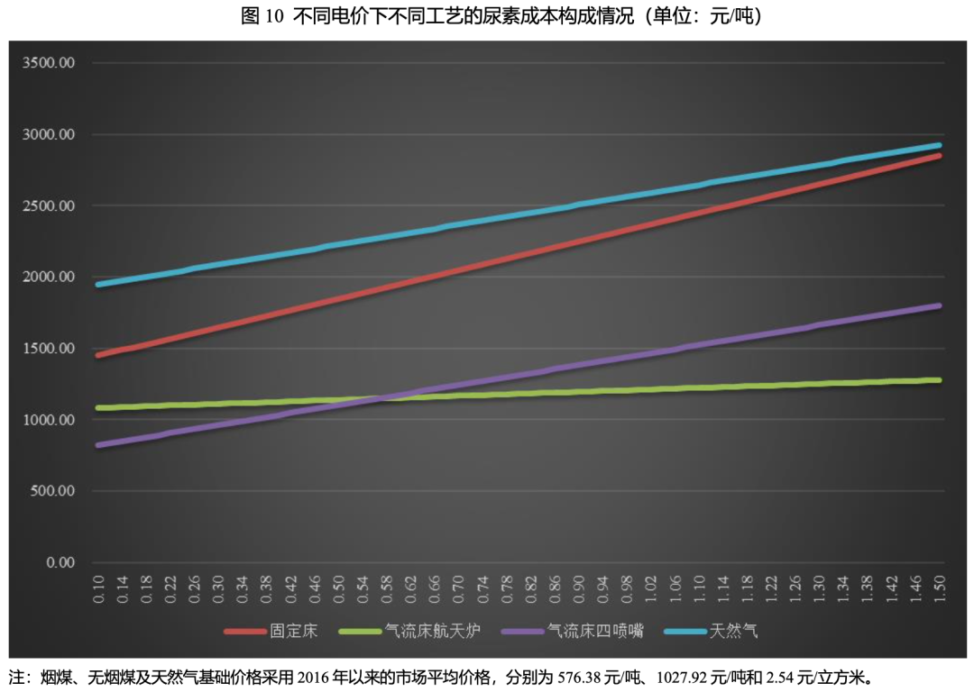 假設(shè)其他期間費(fèi)用以及原材料價(jià)格不變,其中煙煤、無煙煤及天然氣基礎(chǔ)價(jià)格采用2016年以來的市場平均價(jià)格,分別為576.38元/噸、1027.92元/噸和2.54元/立方米,在電價(jià)起始價(jià)格0.1元/度(現(xiàn)在市場上風(fēng)電發(fā)電的最低成本)分別上漲1倍、4倍和8倍的情況下,不同工藝下尿素的生產(chǎn)成本上漲幅度如下表所示。同時(shí),通過不同電價(jià)測算出不同工藝的成本構(gòu)成如下圖所示。通過數(shù)據(jù)測算可以看出氣流床四噴嘴爐裝置對(duì)電價(jià)的敏感性最高,氣流床航天爐裝置對(duì)電價(jià)的敏感性最低。天然氣工藝和固定床工藝在不同電價(jià)下生產(chǎn)成本始終高于氣流床工藝。當(dāng)電價(jià)小于0.57元/度的情況下,氣流床四噴嘴爐裝置的生產(chǎn)成本更低;當(dāng)電價(jià)高于0.57元/度,氣流床航天爐裝置的生產(chǎn)成本更低。