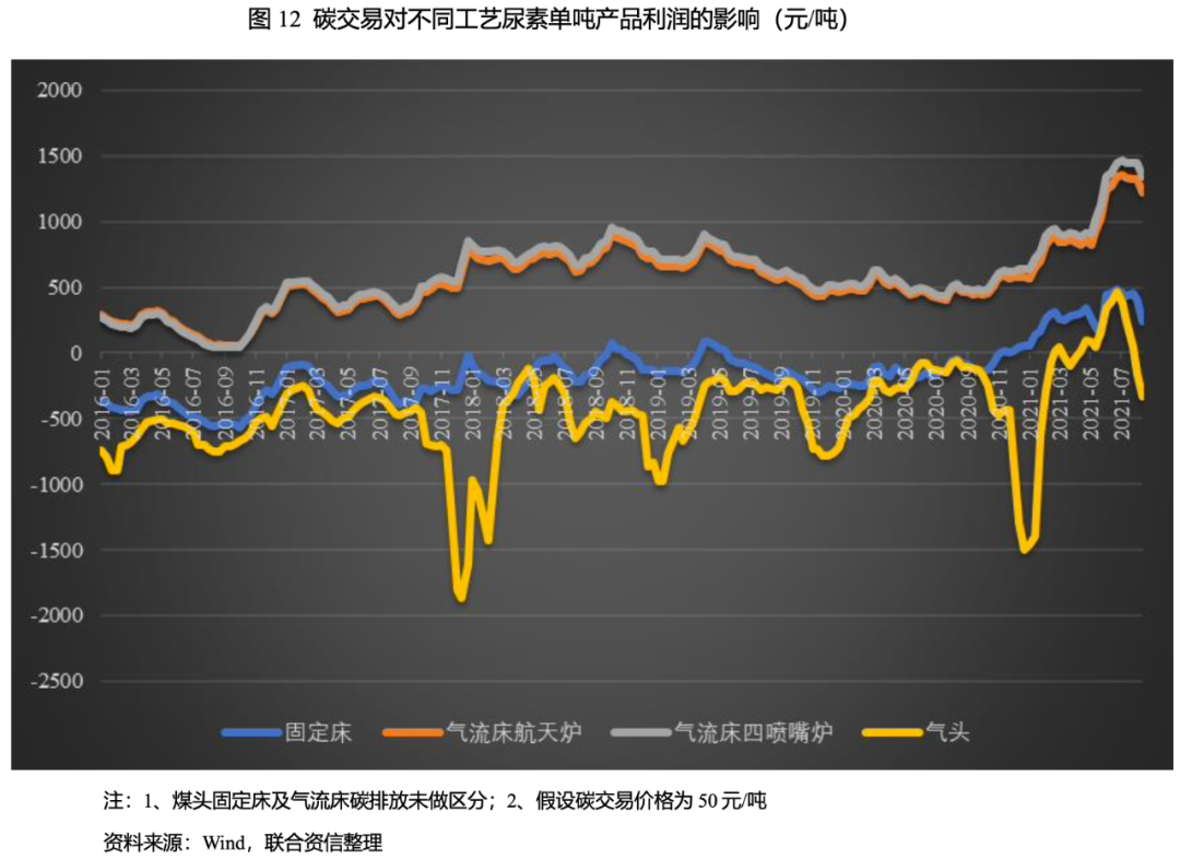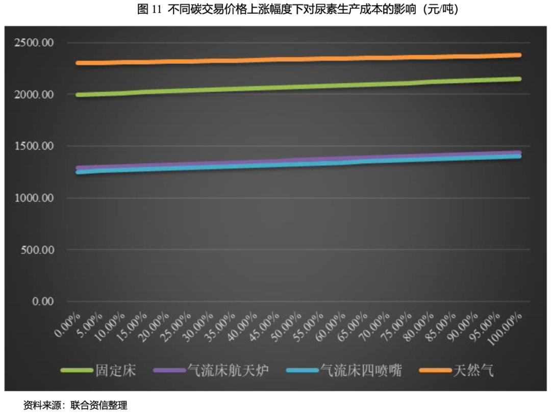 假設(shè)在其他期間費(fèi)用、原材料價(jià)格(煙煤、無煙煤及天然氣基礎(chǔ)價(jià)格采用2016年以來的市場平均價(jià)格,分別為576.38元/噸、1027.92元/噸和2.54元/立方米)以及電價(jià)為0.5元/度不變,在碳交易起始價(jià)格50元/噸(自7月份全國碳市場交易啟動(dòng)以來,全國碳配額價(jià)格一直維持在50元/噸以上,期間最高價(jià)曾超過60元/每噸,因此下文假設(shè)碳交易成本為50元/噸作為起始成本),不同工藝下尿素的生產(chǎn)成本上漲幅度如下表所示。同時(shí),通過不同碳交易價(jià)格測算出不同工藝的生產(chǎn)成本如下圖所示。通過測算可以看出天然氣對(duì)碳交易價(jià)格的敏感性最高,固定床裝置對(duì)碳交易價(jià)格的敏感性最低。雖然煤頭尿素的碳排放量遠(yuǎn)高于氣頭尿素,但碳交易后煤頭尿素企業(yè)的單噸生產(chǎn)成本仍低于氣頭尿素。整體看,碳交易成本對(duì)尿素生產(chǎn)成本的敏感性較低。