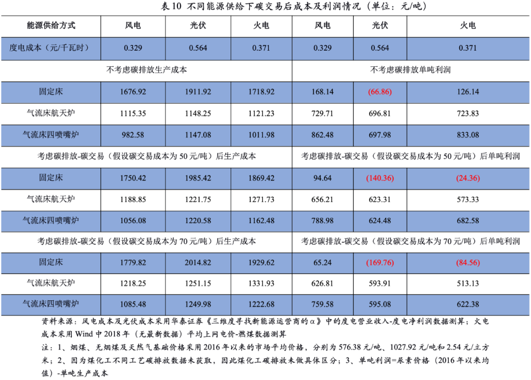 當(dāng)前我國電力供給主要有光伏、風(fēng)電、火電及核電,下文假設(shè)尿素生產(chǎn)過程中電力及熱能主要通過光伏、風(fēng)電、火電三種方式自供。風(fēng)電及光伏自供的度電成本采用市場上風(fēng)電或光伏企業(yè)2016-2020年的度電營業(yè)收入–度電凈利潤平均值測算,火電自供的度電成本采取上網(wǎng)電價(jià)測算。同時(shí),光伏及風(fēng)電作為清潔能源,在能耗產(chǎn)生過程中的碳排放量為零;進(jìn)而考慮在碳交易(假設(shè)碳交易成本為50元/噸)的背景下,測算不同能源供應(yīng)下碳交易后成本及利潤情況。從下表可以看出,風(fēng)電的度電成本較低,不同工藝下均具有成本優(yōu)勢(shì),其中氣流床四噴嘴爐裝置的生產(chǎn)成本最低。光伏因?yàn)槎入姵杀据^高,不同工藝下生產(chǎn)成本均高于火電及風(fēng)電的能源供應(yīng)方式;而氣流床航天爐裝置和氣流床四噴嘴爐裝置的生產(chǎn)成本相當(dāng)。在考慮碳排放-碳交易后可以看出,風(fēng)電作為能源供應(yīng)的方式成本優(yōu)勢(shì)更為明顯。光伏作為能源供應(yīng)的方式下,氣流床航天爐裝置的成本優(yōu)勢(shì)大于火電,其他工藝仍然不及火電;但是隨著碳交易成本提升,光伏作為能源供應(yīng)的方式成本優(yōu)勢(shì)均大于火電。整體看,風(fēng)電基于其較低的度電成本及清潔性導(dǎo)致碳排放量較少進(jìn)而具有很大的優(yōu)勢(shì),但是尿素企業(yè)就地獲取風(fēng)電資源的難度較大。光伏資源清潔性較好,但度電生產(chǎn)成本較高,在碳交易價(jià)格低于70元/噸時(shí),優(yōu)勢(shì)不太明顯。但是未來隨著碳排放指標(biāo)的逐步收緊,碳交易價(jià)格或?qū)⒊掷m(xù)提升,光伏作為清潔能源將替代火電資源成為尿素企業(yè)的主要能源供應(yīng)來源。