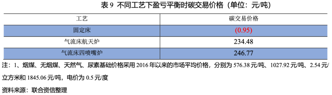 通過上文測算發(fā)現(xiàn)原材料價(jià)格變動(dòng)對(duì)尿素的生產(chǎn)成本影響很大,因此不同原材料價(jià)格下碳交易后能否實(shí)現(xiàn)盈利至關(guān)重要。下圖選取2016年以來不同原料的歷史數(shù)據(jù)以及尿素價(jià)格的歷史數(shù)據(jù),通過尿素碳交易后單噸利潤公式(碳交易后單噸利潤=尿素價(jià)格–尿素成本–碳交易成本)測算可以看出氣頭尿素利潤<煤頭固定床裝置利潤<煤頭氣流床裝置利潤,雖然煤頭尿素的碳排放量遠(yuǎn)高于氣頭尿素,但煤頭尿素企業(yè)的單噸利潤仍高3于氣頭尿素,主要系我國天然氣資源緊張,氣頭尿素的原料成本較高所致。同時(shí),煤頭氣流床工藝基本均實(shí)現(xiàn)了盈利,氣流床航天爐裝置和氣流床四噴嘴爐裝置的單噸利潤差距不大,天然氣及固定床工藝產(chǎn)生虧損的可能性很大。因此,煤頭氣流床工藝在碳交易后優(yōu)勢(shì)顯著,其中氣流床航天爐裝置和氣流床四噴嘴爐裝置的優(yōu)勢(shì)相當(dāng)。整體看,雖然煤頭尿素的碳排放量遠(yuǎn)高于氣頭尿素,但碳交易后煤頭尿素企業(yè)的單噸利潤仍高于氣頭尿素,采用煤頭氣流床工藝的企業(yè)更具優(yōu)勢(shì)。在當(dāng)前碳交易價(jià)格下,煤頭氣流床尿素單噸利潤仍較好,尿素企業(yè)的減碳動(dòng)力不足。