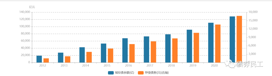 以wind資訊的城投債的統計數據來看,截至2021年12月3日,城投債存量金額為12.83萬億,存量債券只數為16,686只。如果只是以數據趨勢來看,城投債的存量金額和存量只數還是處于增長的趨勢。