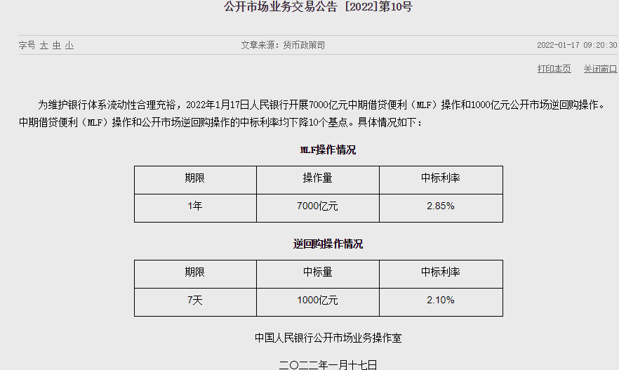 2022年1月17日,央行7000億元1年期MLF(中期借貸便利)操作,利率2.85%,此前為2.95%;同日進行1000億元7天期逆回購操作,中標利率2.1%,從原來的2.2%下調10個基點。