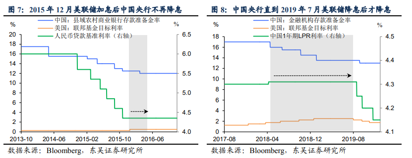 簡單說,2015年12月美聯儲加息后,我國央行不再降息;然后,我國央行直到2019年7月美聯儲降息后,才跟著降息。