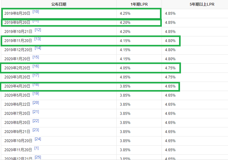 這還沒有完,2019年11月,1年期LPR再次下調,從4.20%,降至4.15%;同月5年期LPR開啟了上一輪降息周期的首次下調,從4.85%,降至4.80%。