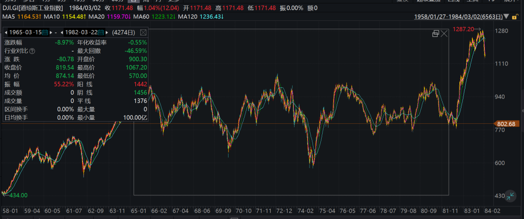 從1965年3月到1982年3月,道瓊斯工業指數17年原地踏步,如果定投道瓊斯指數,那么17年下來還是負收益。