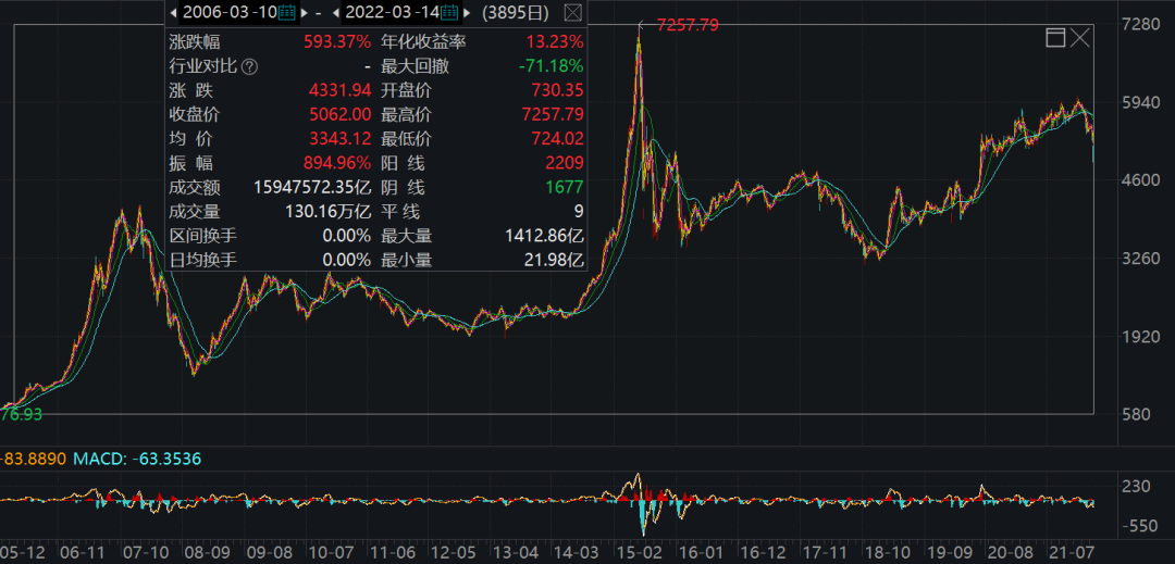 假設從接近底部的2006年3月10號投資股市,用萬得全A指數來代表投資收益率,那么過去16年指數從730點上漲到現在的5062點,的復合年化收益率是13.23%,這個收益率看起來確實還不錯。