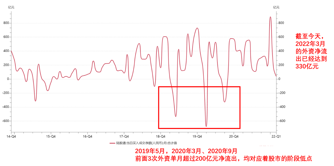 最后來點正能量,近期外資持續流出A股,3月份已經凈流出330億元了,從歷史回溯看,外資單月凈流出超出200億元的時候,均對應著一個1年左右周期的底部。真正的底部應該不遠了
