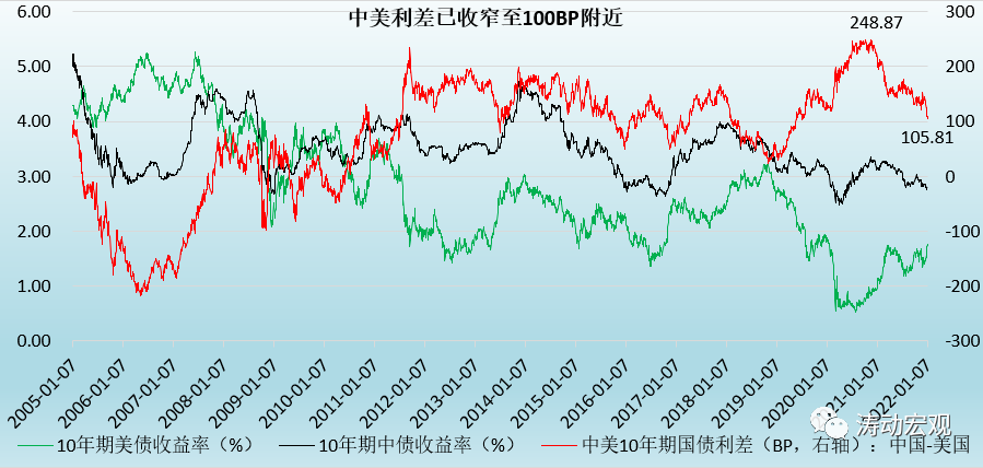 美債收益率的上行直接影響中美利差的變化。截至2022年1月 7日,中國和美國10年期國債收益率分別為2.82%和1.76%,中美利差相應(yīng)收窄至106BP,創(chuàng)下2019年5月以來新低,較2020年11月的250BP附近收窄140BP左右。