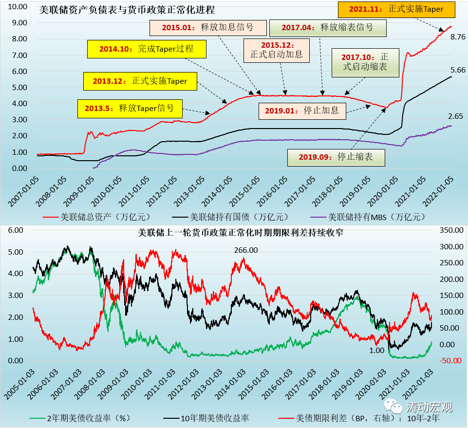 2021年12月以來的美債收益率快速上行、2022年1月5日公布的12月美聯(lián)儲(chǔ)會(huì)議紀(jì)要等諸多證據(jù)均表明,美聯(lián)儲(chǔ)將于2022年3月完成Taper、2022年3-4月啟動(dòng)加息(預(yù)計(jì)全年加息3-4次),同時(shí)在加息啟動(dòng)之際將很快啟動(dòng)縮表,以改變上一輪貨幣政策正常化周期所帶來的利率曲線平坦化困境,這意味著本輪美聯(lián)儲(chǔ)加息與縮表的節(jié)奏要明顯快于上一輪貨幣政策正常化時(shí)期。