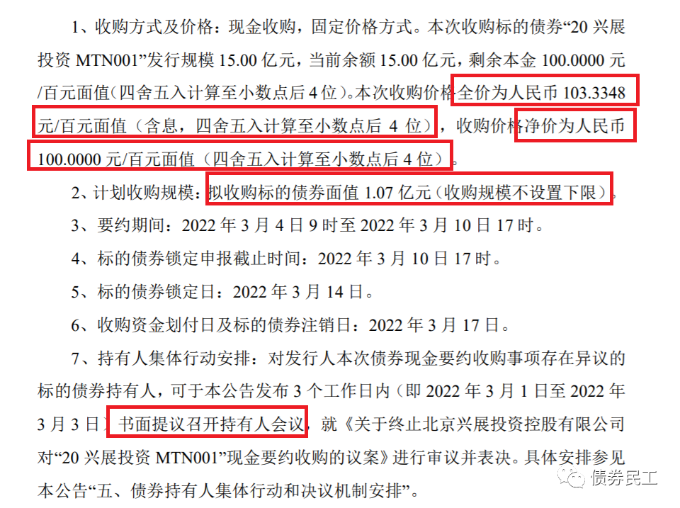 根據(jù)北京興展投資控股有限公司(以下簡稱“興展投資”)于2022年3月17日發(fā)布的《北京興展投資控股有限公司關(guān)于對“20興展投資MTN001”現(xiàn)金要約收購的公告》,本次現(xiàn)金要約收購已完成,持有人沒有申報標(biāo)的債券,最終收購面額為0。在此之前的2022年2月28日,興展投資發(fā)布公告,對“20興展投資MTN001”開展現(xiàn)金要約收購,收購價格全價為人民幣103.3348元/百元面值,收購價格凈價為100元/百元面值。
