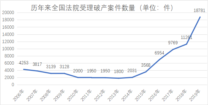 2019年全國法院受理破產和強制清算案件數量為1.8萬,距離我所說的100萬有著相當大的差距。但我認為,100萬是合理預測,并非忽悠,甚至說這是一個不可逆轉的趨勢,尤其在個人破產法的腳步聲已經清晰可聞之時。我們從事破產業務的人應當正視這一趨勢,順應這一趨勢,從而推動破產法律制度發揮其應有作用。
