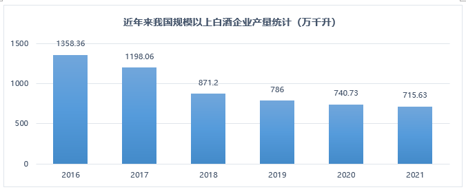 中國酒業協會數據顯示,近年來,國內規模以上白酒企業總產量不斷下滑,由2016年的1358.36萬千升,下降至2021年的715.63萬千升,五年間下降了47.32%。