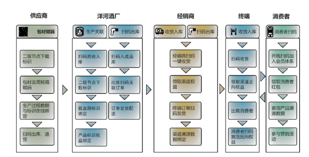 比如,通過瓶箱關聯體系,在包裝箱和產品上附著二維碼,當經銷商和終端網點收貨時均需掃碼。可極大地杜絕制假、造假和區域竄貨,以及擾亂市場價格秩序的亂價問題。