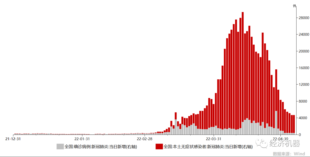 • 疫情防控:這波高峰已過,正在邊際好轉。我國每日新增確診人數和無癥狀感染人數從高峰期的接近3萬人,降至目前4000人左右(圖1),基本得到控制。隨著后續核酸檢測常態化,或會找到一條動態清零與經濟的共存之路。