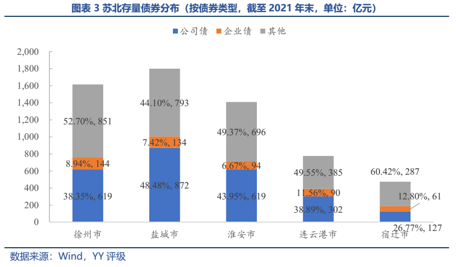從債券結(jié)構(gòu)來看,公司債、企業(yè)債和協(xié)會產(chǎn)品的占比分別為41.81%、8.60%和49.58%。注意到,鹽城的公司債占比最高(48.48%),結(jié)合前段時間交易所控城投債比例的輿情來看,潛在的再融資壓力整體偏高。