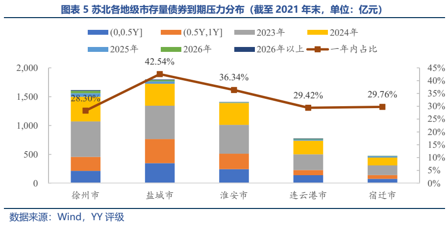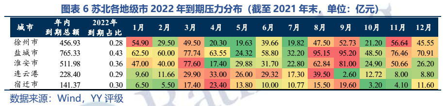 從存量債券來看,截至21年末區(qū)域城投債余額合計6,073.25億元(作為參考,同期末湖南7,656億元)。細(xì)分來看,鹽城市債券余額最多(1,799.08億元),綜合實力最強的徐州次之,淮安相較于其體量而言規(guī)模偏大(YY Ratio 1,451.96%,全省最高),宿遷余額最小(473.97億元)。另外注意到鹽城市2022年債券到期壓力較大(年內(nèi)到期占比超40%)。