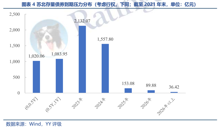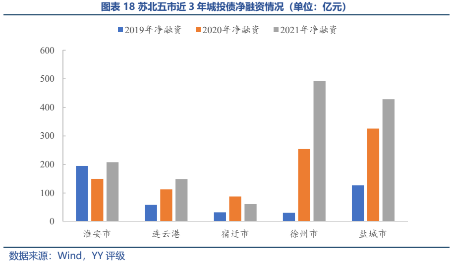 雖然目前區(qū)域再融資環(huán)境仍較好,19-21年城投債凈融資分別為443億元、930億元和1,339億元。且城投不應(yīng)割裂開來看,如果從江蘇全省一盤棋的角度出發(fā),蘇大強信仰的支撐強,屬于靠自身、靠省里,仍有積極的空間,安全距離較大。